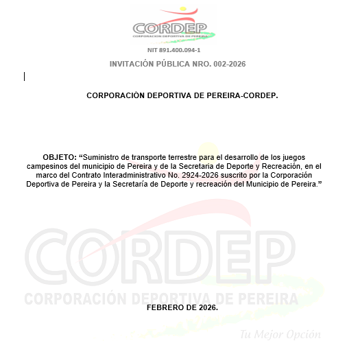 La Corporación Deportiva de Pereira – CORDEP, en adelante la “Corporación”, pone a disposición de los interesados la Invitación Publica Nro. 002-2026 para la contratación de transporte terrestre para los deportistas del contrato interadministrativo no. 2924-2026 suscrito entre la Corporación Deportiva de Pereira y la Secretaría De Deporte y Recreación Del Municipio De Pereira para el desarrollo de los juegos campesinos del municipio de Pereira.